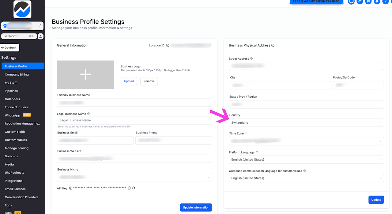 Settings ➡️ Business Profile ➡️ Business Physical Address ➡️ Country